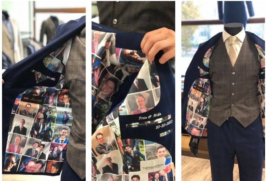 Lever je eigen ontwerp aan of laat ons helpen bij het creëren van een stijlvolle fotocollage — wij zorgen ervoor dat het professioneel wordt gedrukt op de binnenvoering van jouw maatpak. Zo maak je jouw pak écht uniek, van binnen én van buiten. Vraag in de showroom naar de mogelijkheden en ontdek hoe jij jouw persoonlijke touch aan je maatpak kunt geven.